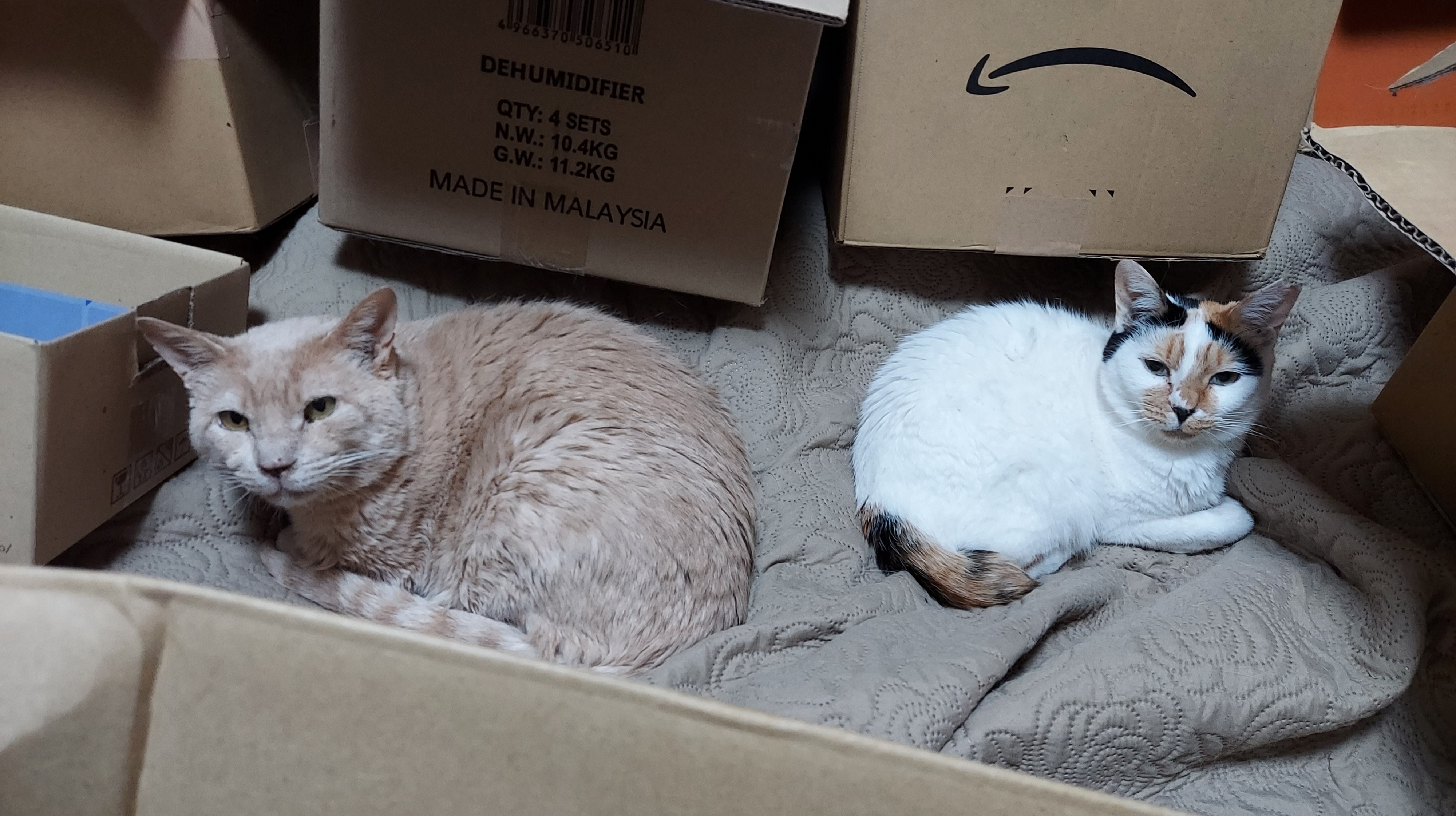 なんと実力行使で段ボールをベッドから落とし寛いでいました。