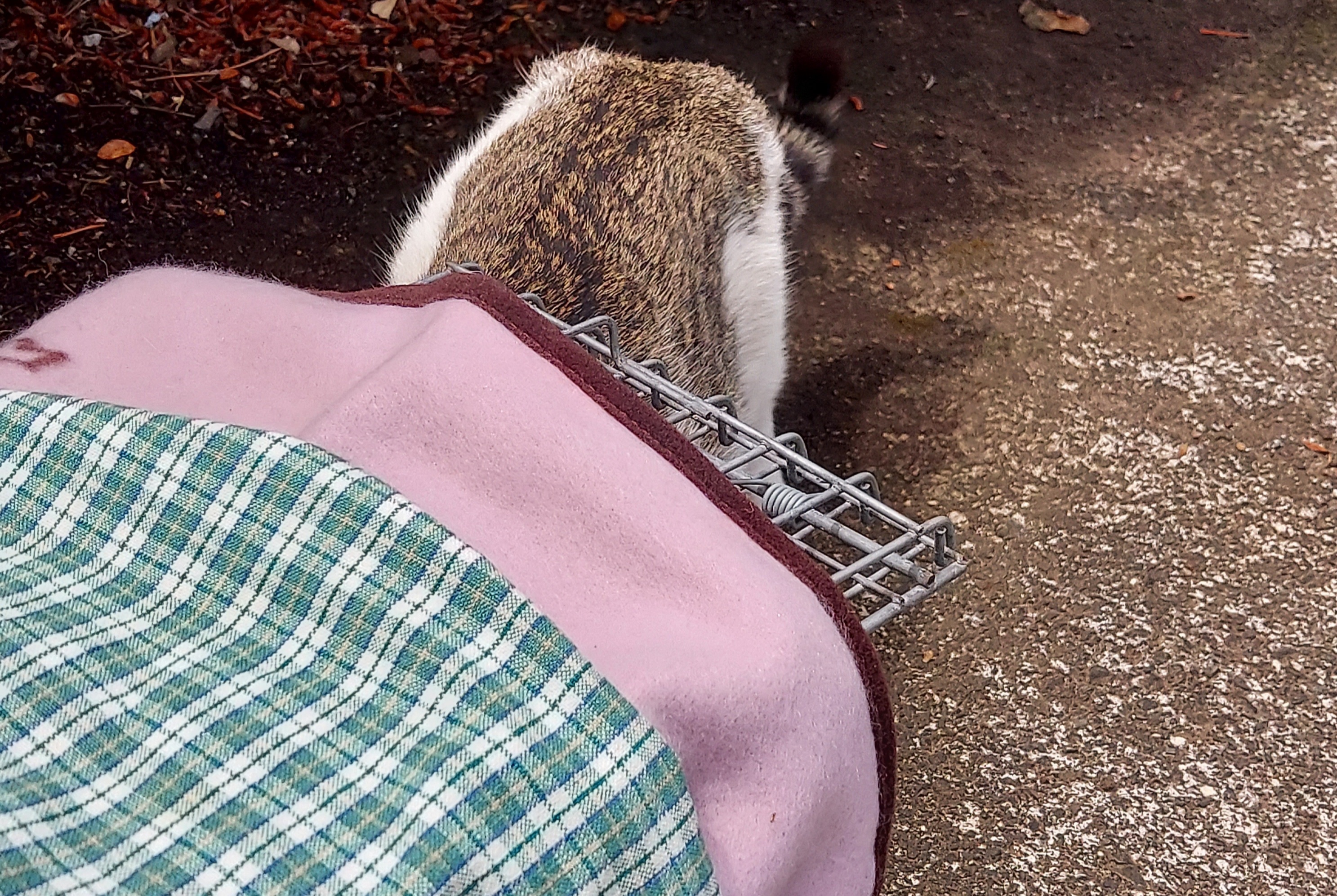 植え込みがぐるっとマンションと道路の境界にあり子猫の姿を探し出すのは難しく、雨が降ったら体温が下がり危険なので外階段の下の濡れない場所に捕獲器を移動するようお願いして、病院の最終受け付けの19時半までにママ猫の避妊手術前泊で届けなければならず、そこを後にしました。