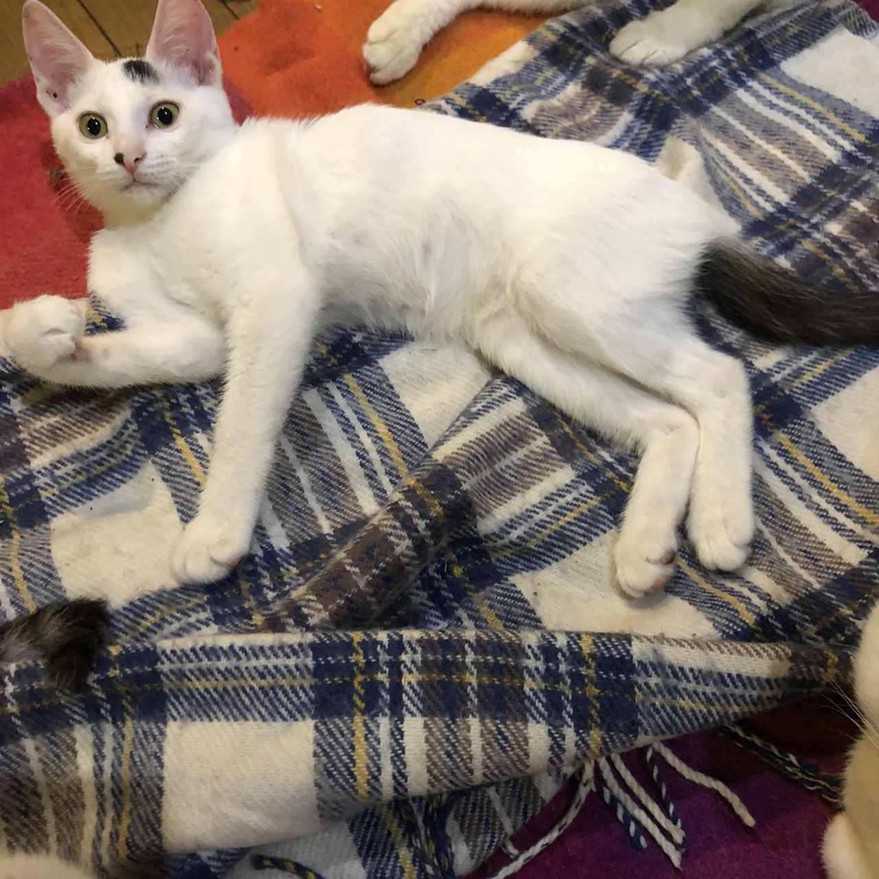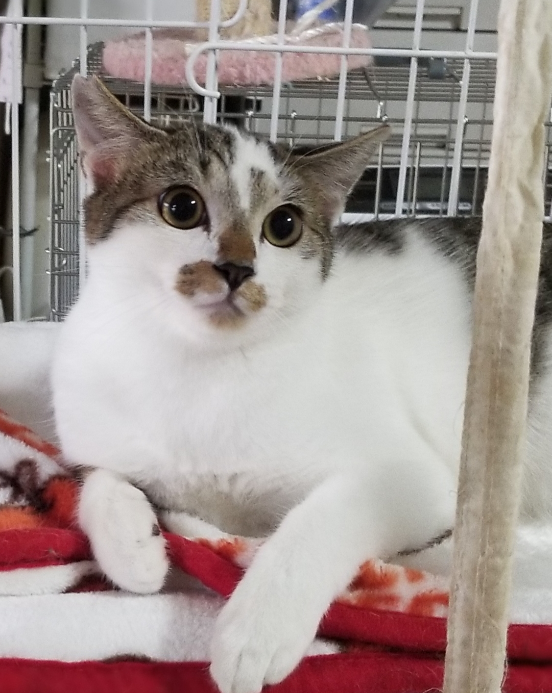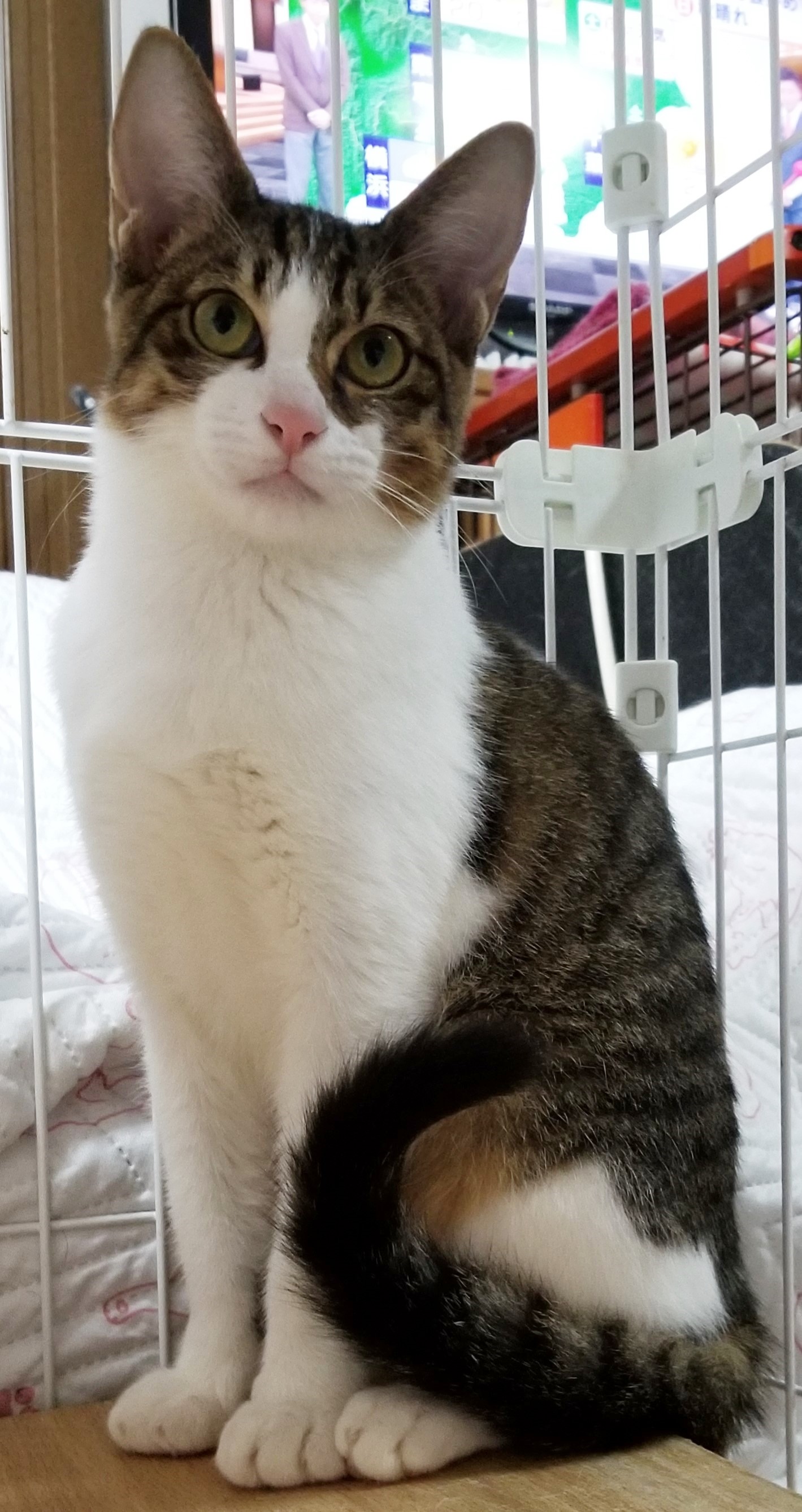 三姉妹の末っ子で、姉二人は既に譲渡したけれど、一番びびりで、なかなか人に馴れず、まだ残っています。ご飯より遊びが好きで、遊び始めると止まりません。体力抜群。遊び終わってウトウトし始めた頃、少しナデナデは出来るようになりましたが、気持ちよさそうにしているかと思うと、ぱっと目を開け、「なでられてしまった!」みたいな顔をします。保護している他の猫と先に遊び始めると、「私と遊んでよ」と言いたげにに、前足でちょんちょんと触ってきます。3ヶ月間くらいほとんど声を出しませんでしたが、最近は、ケージから出たい時や遊んで欲しい時に、小さい声で鳴くようになりました。でも、自分から進んで近寄ってきたりすることはなく、近づくと少し距離をおきます。(Sさんの紹介文より転用記載しています)
