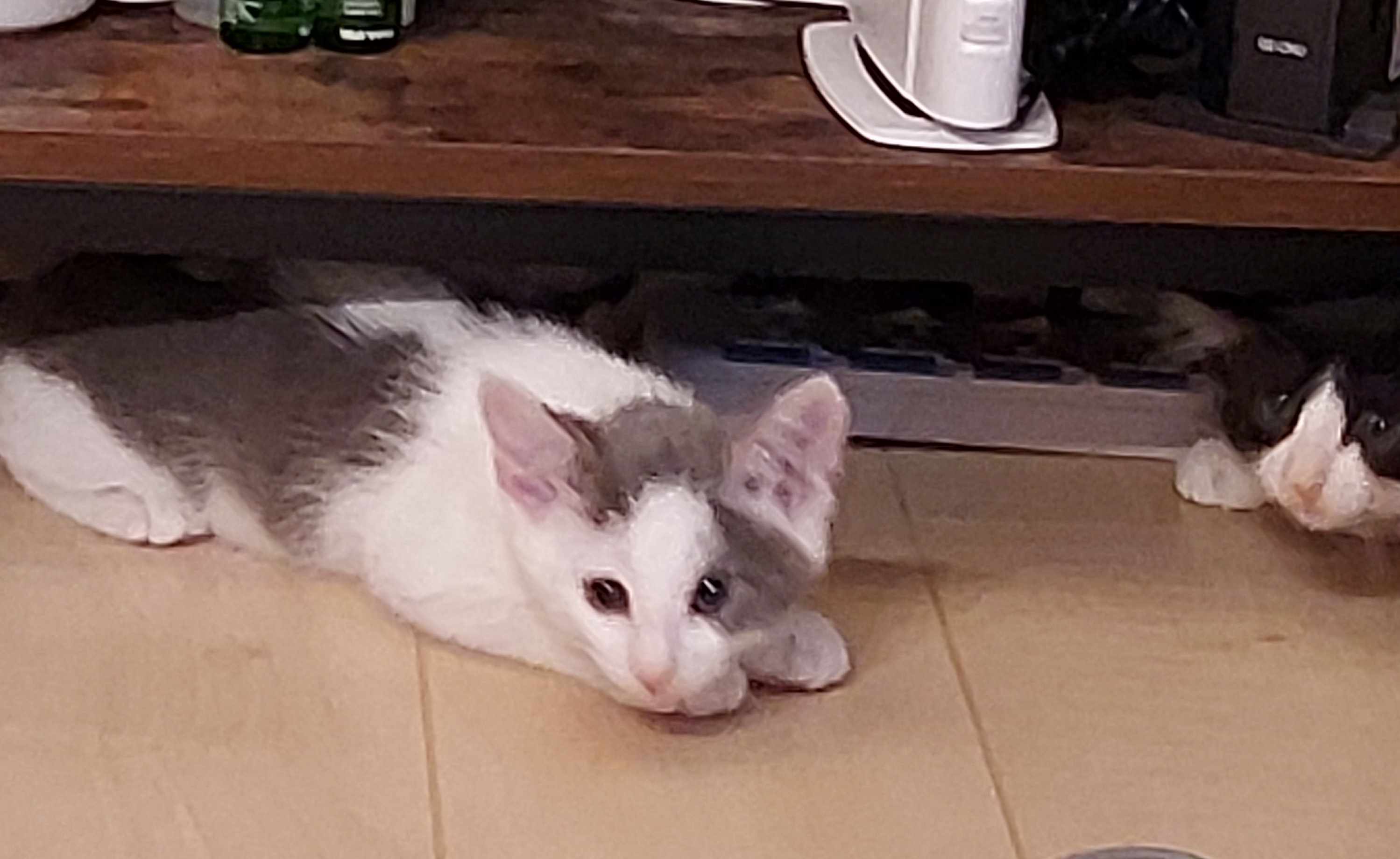 キッチンの方にみんにゃでぞろぞろ行ってから、みんにゃ戻ってしまい取り残されたままにちゃんはにゃんにゃん鳴いてみんにゃを呼んでいました。