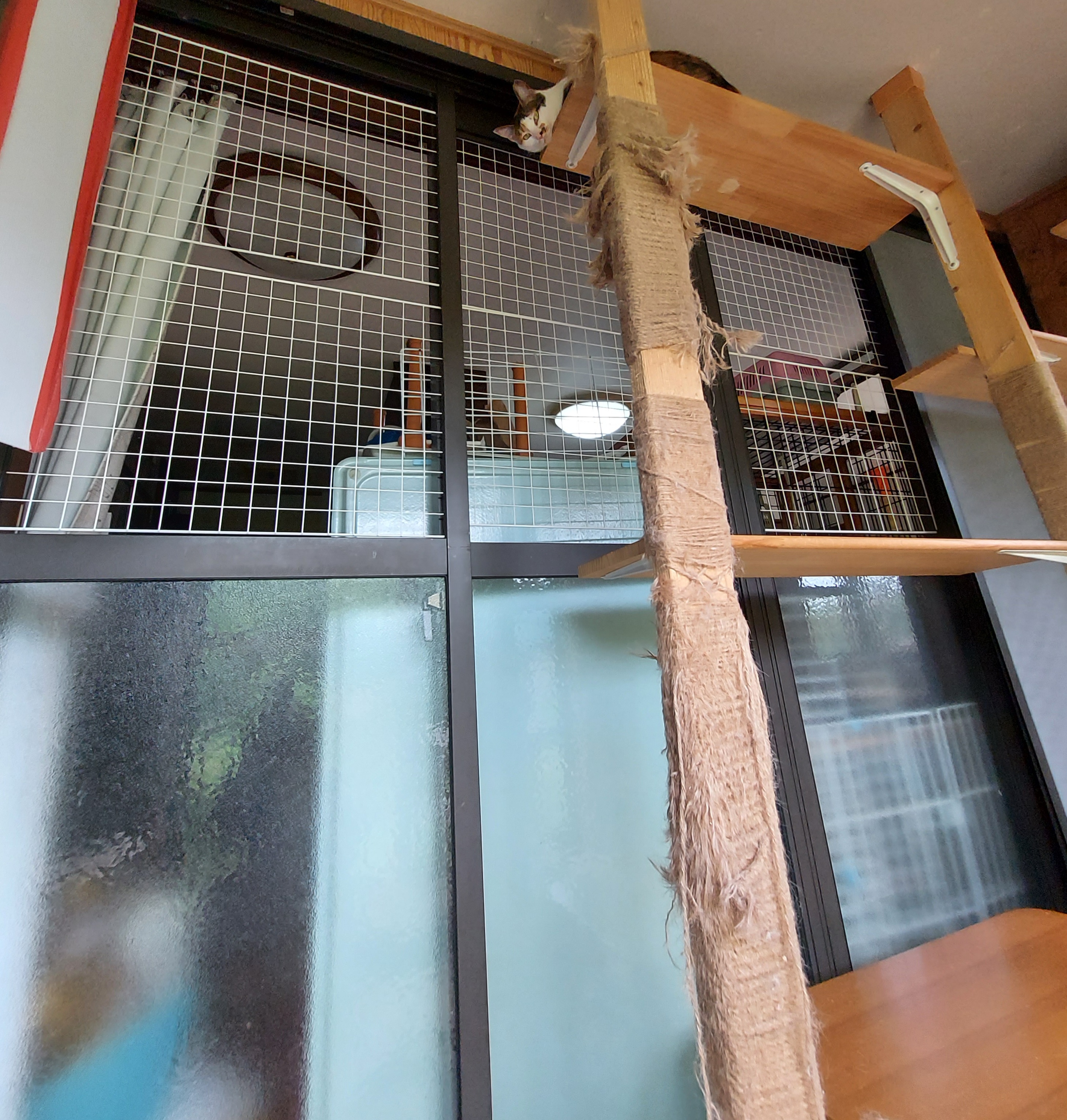保護猫部屋に入るにはゲージの上に登ってサッシのメッシュのジョイント隙間から入るしかありません。