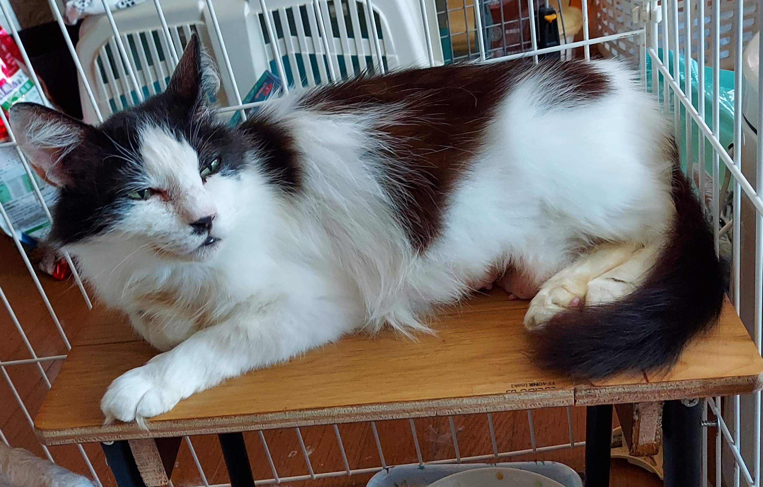 半長毛の綺麗な子ですが4匹生んで5匹育てたので今は美味しいものを体に取り込みたい一心です。身重でエサやりさんに可愛がられていましたが、親子での保護を依頼されました。