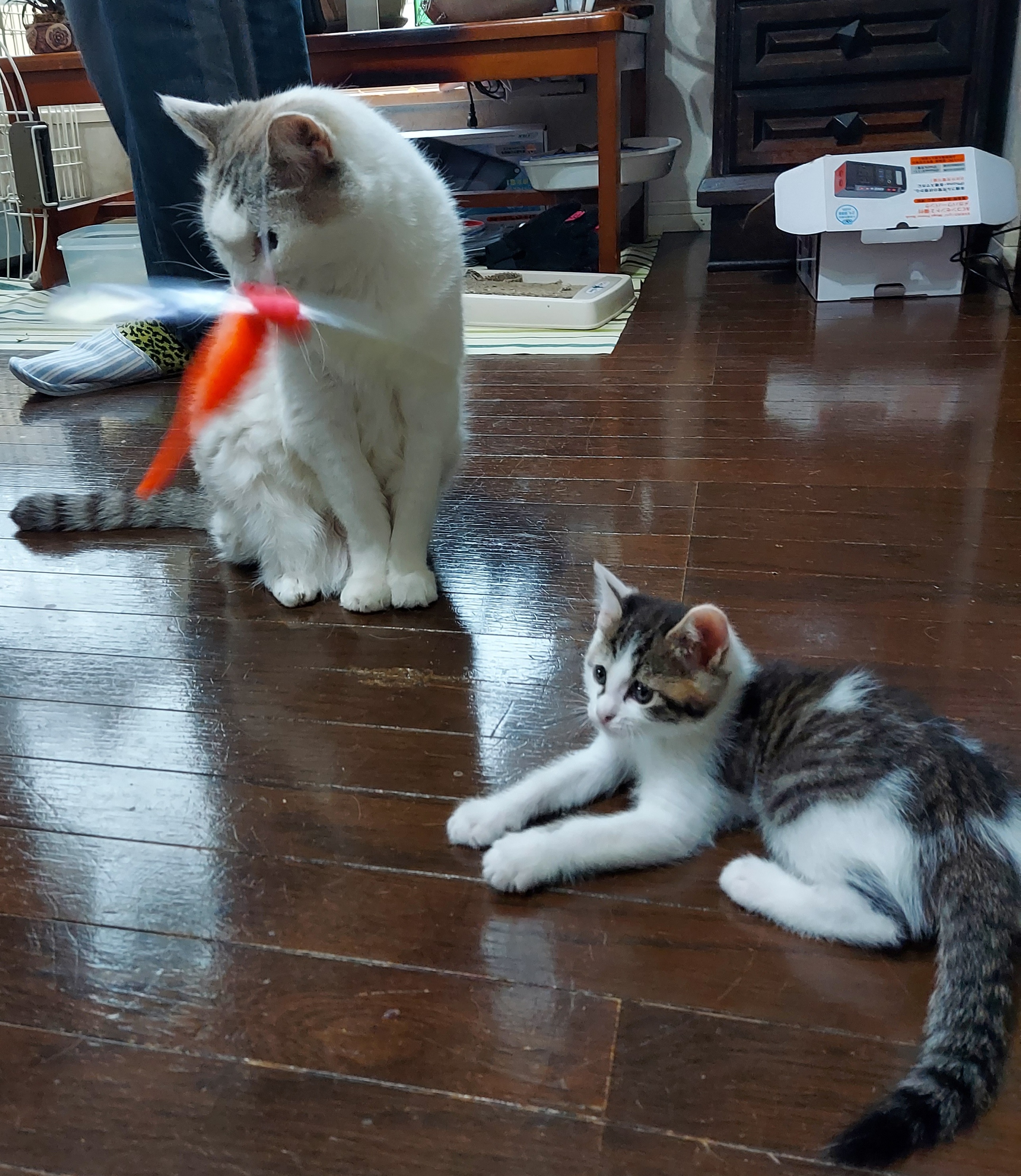 預かりさんのところの茶白のたまきくん、1カ月弱、キラくん2か月。