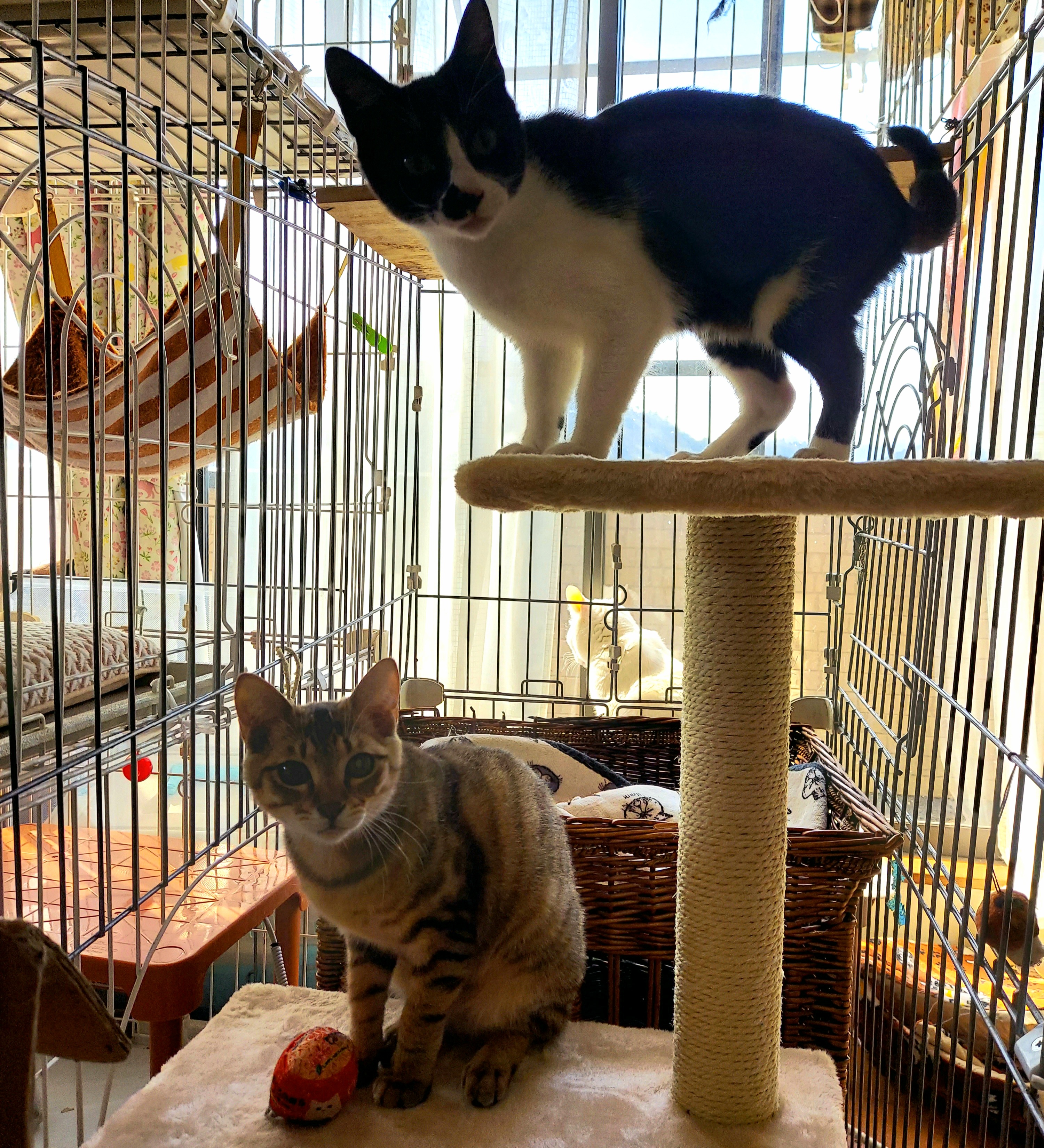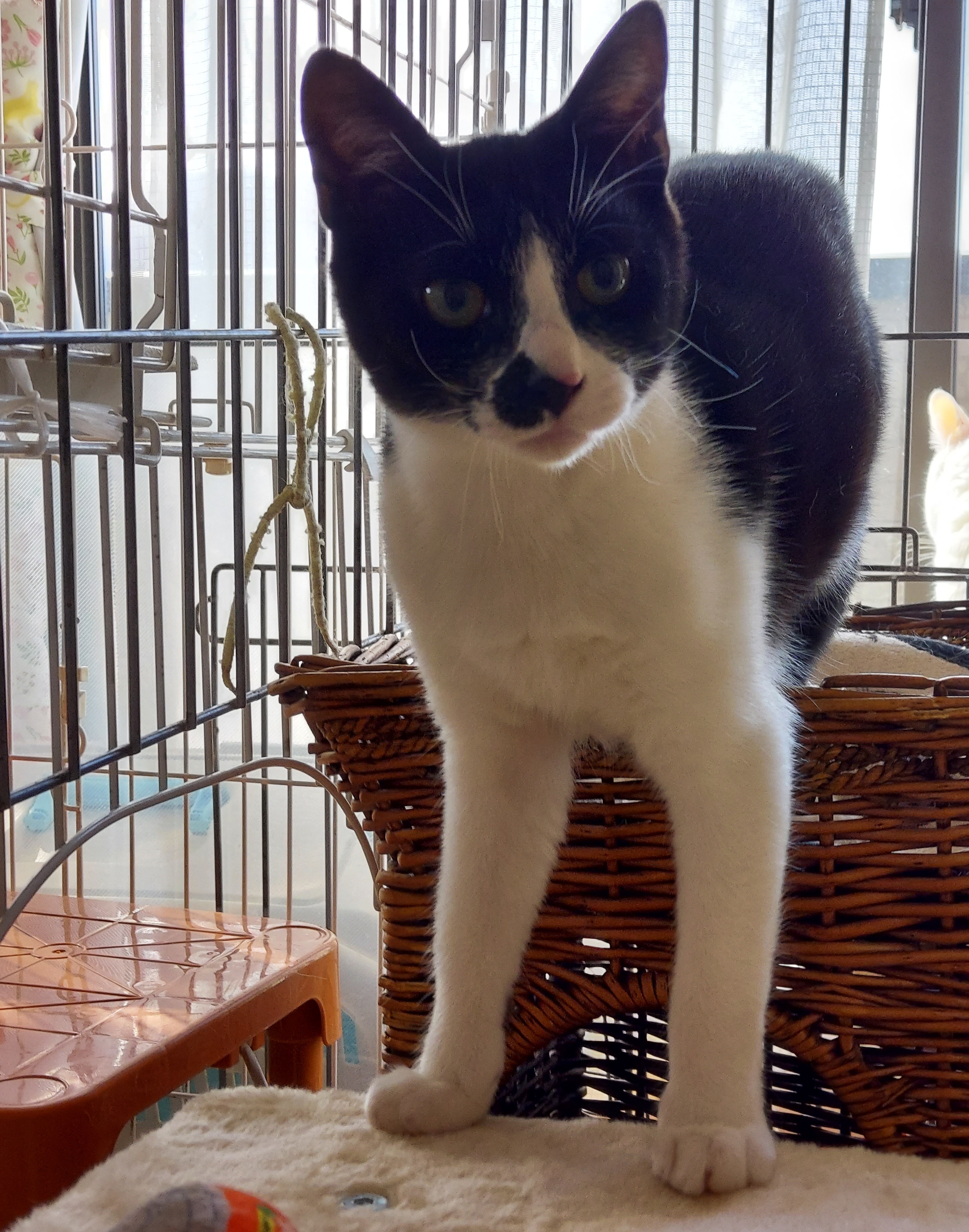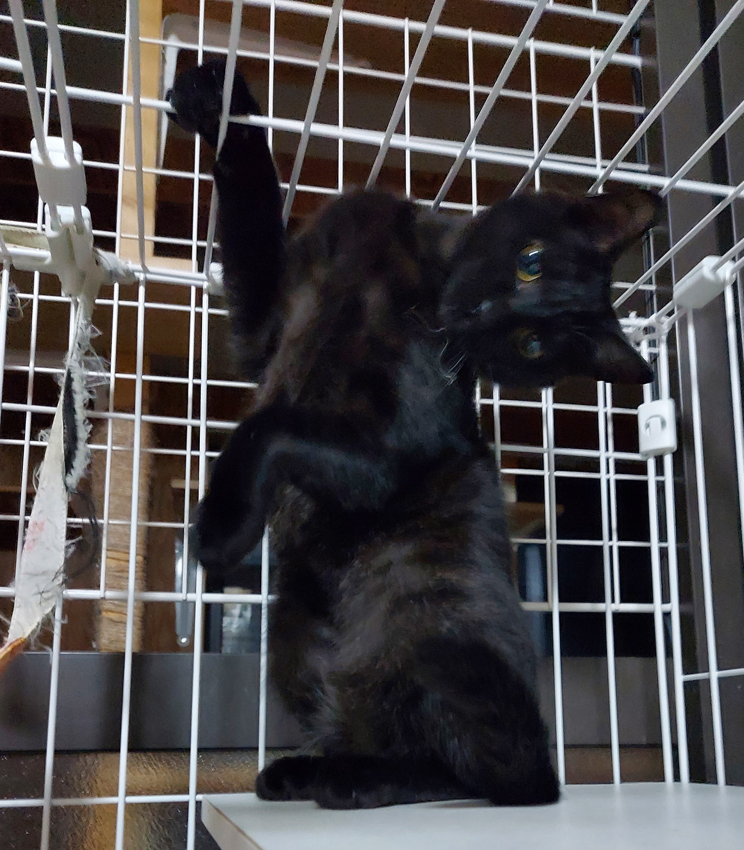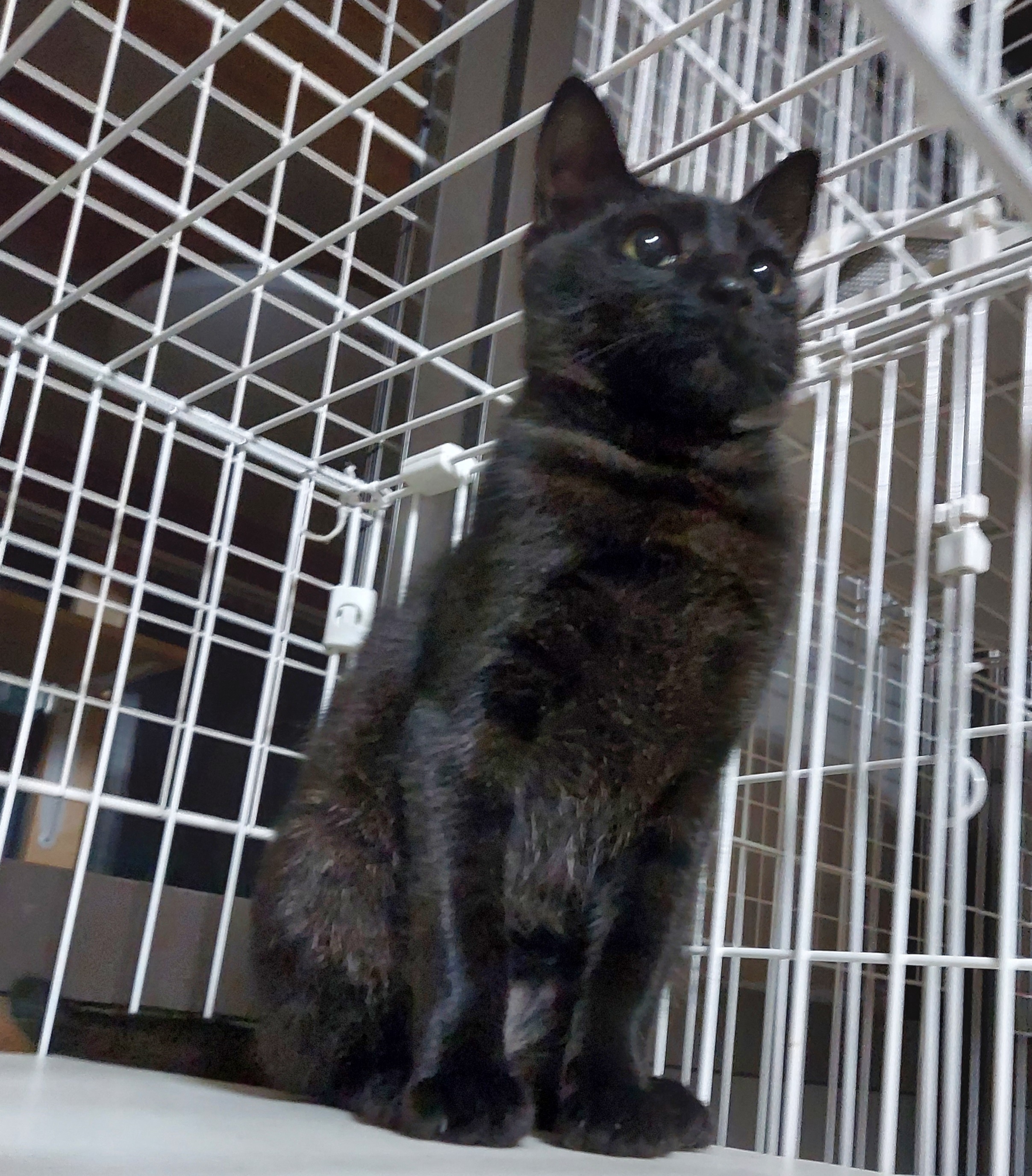同室のシニア猫たちへの感染予防のためゲージから出してあげることはできません。