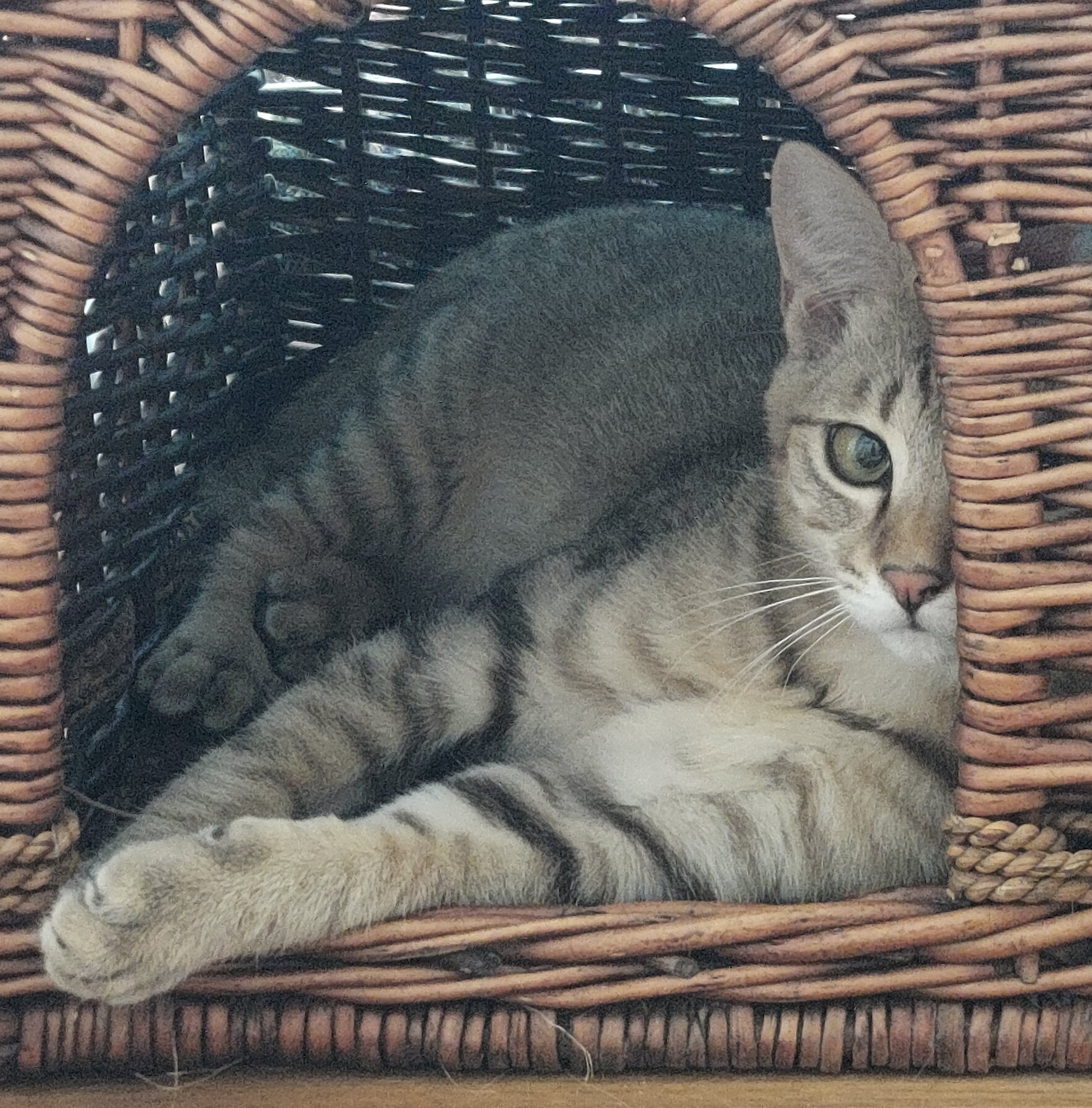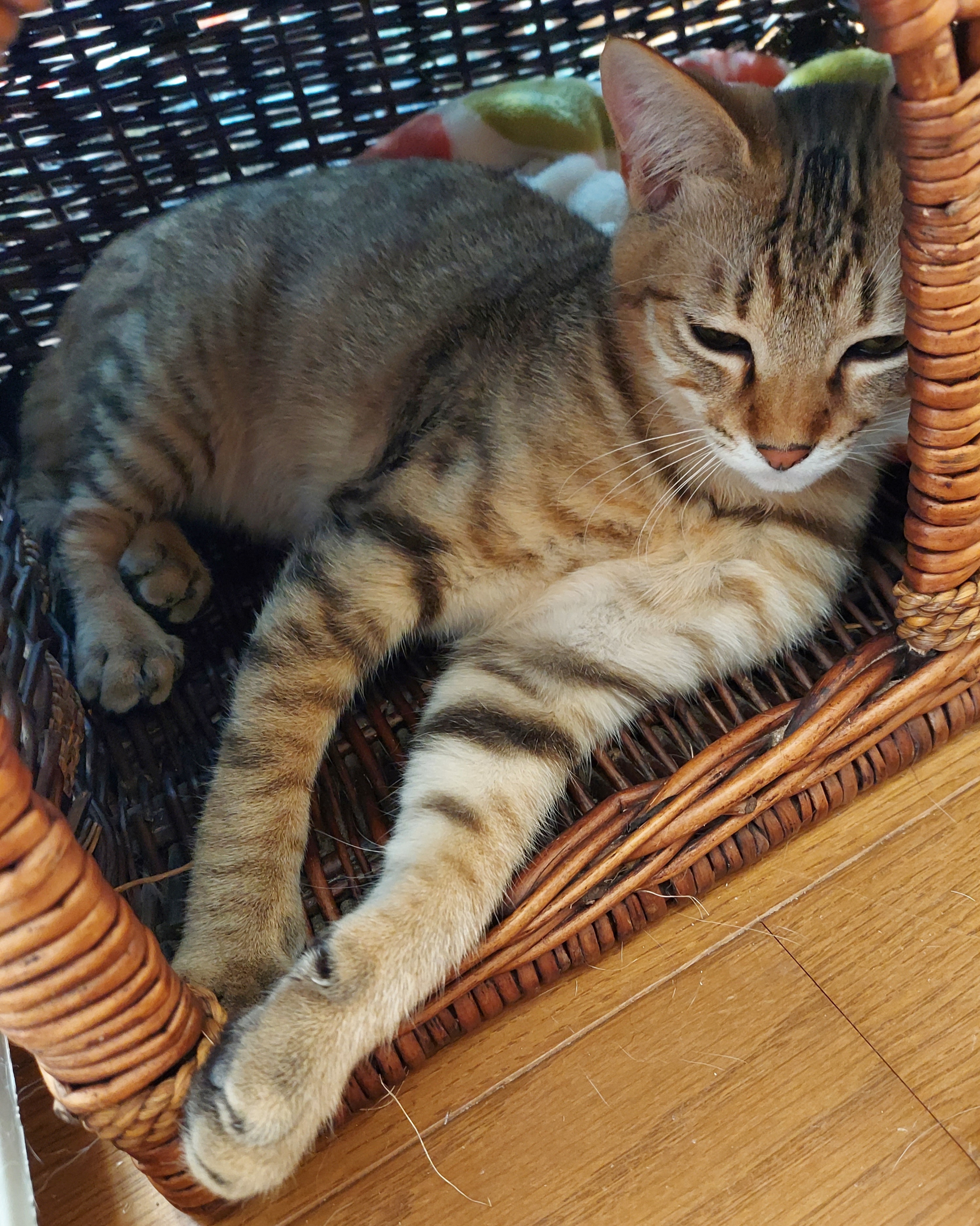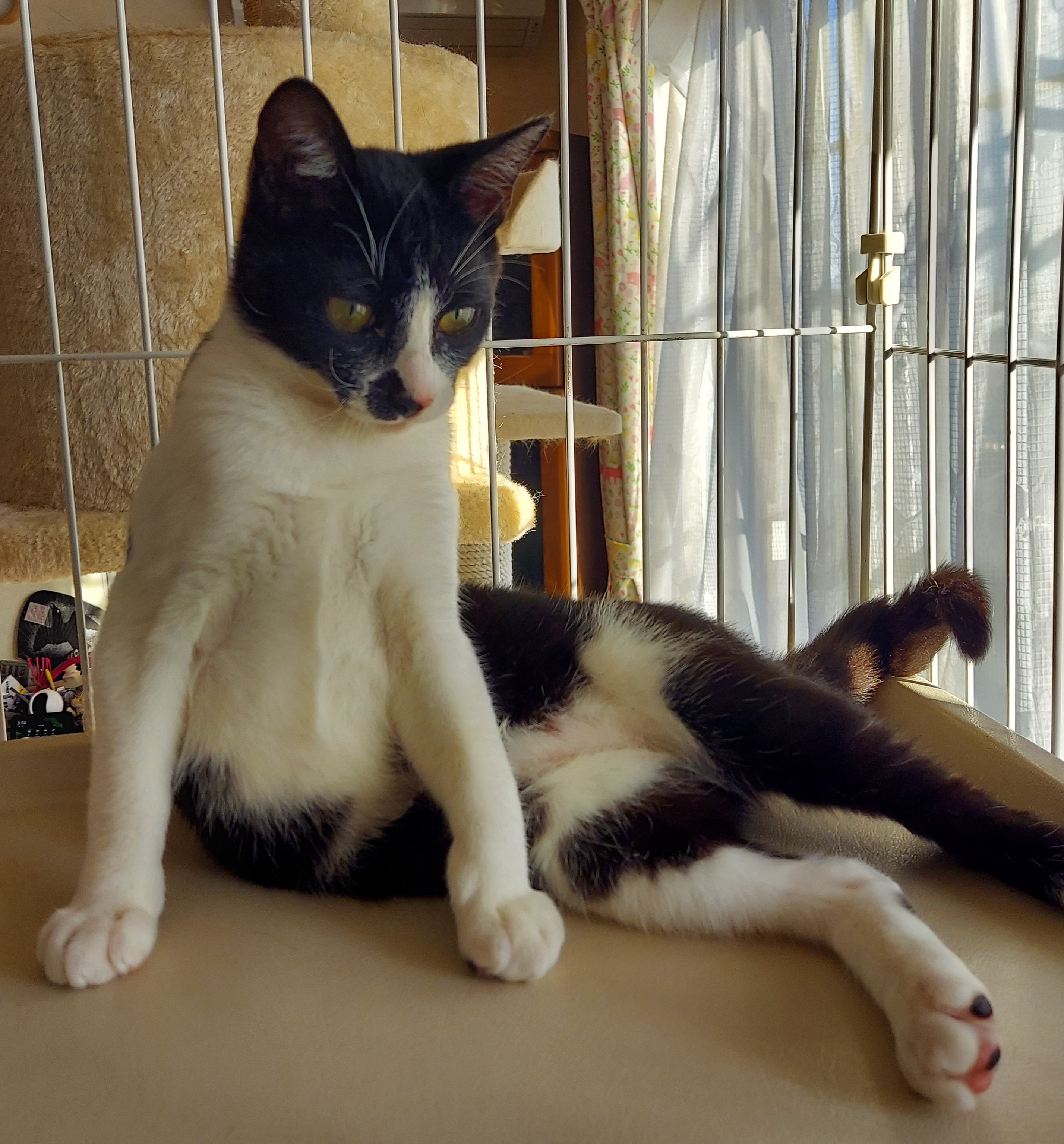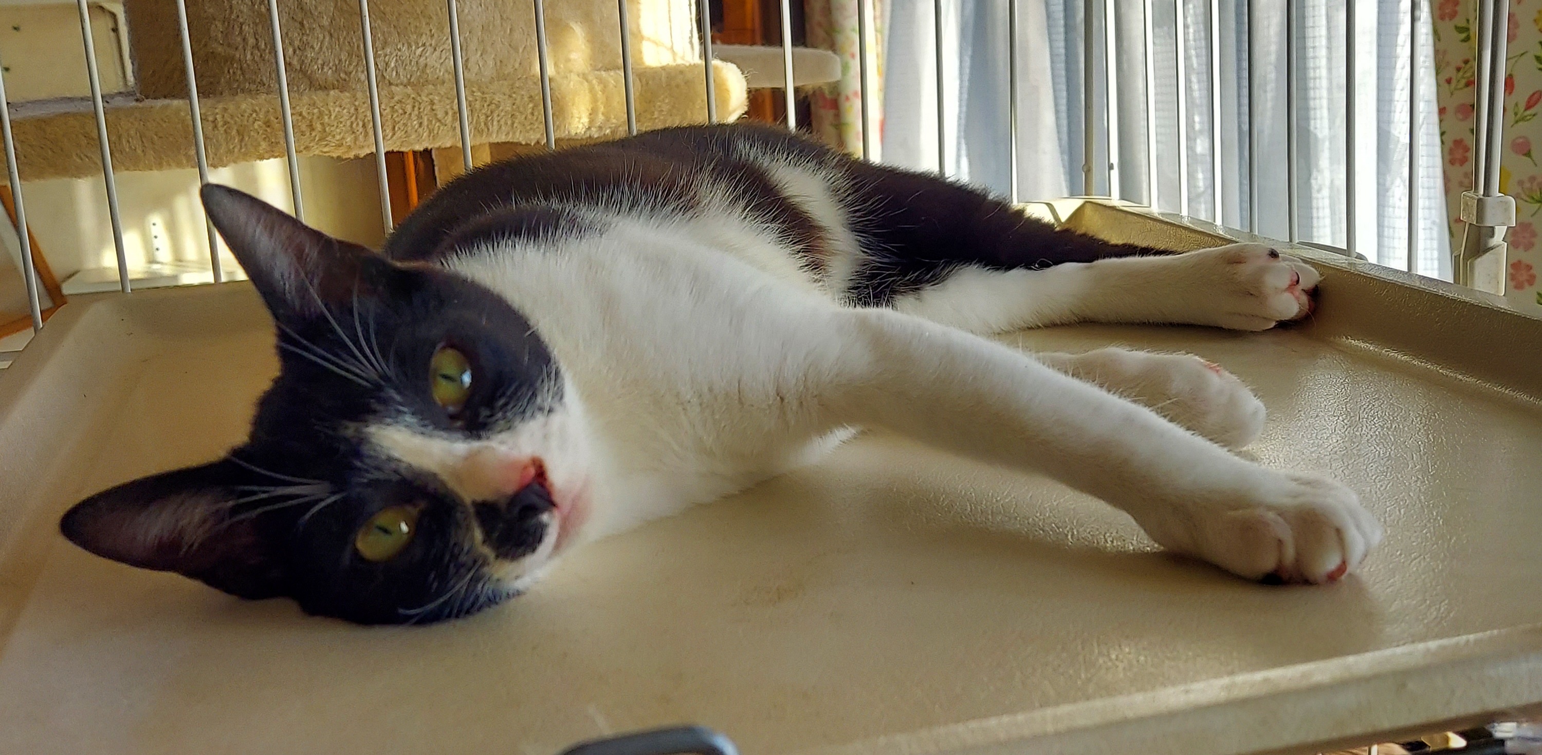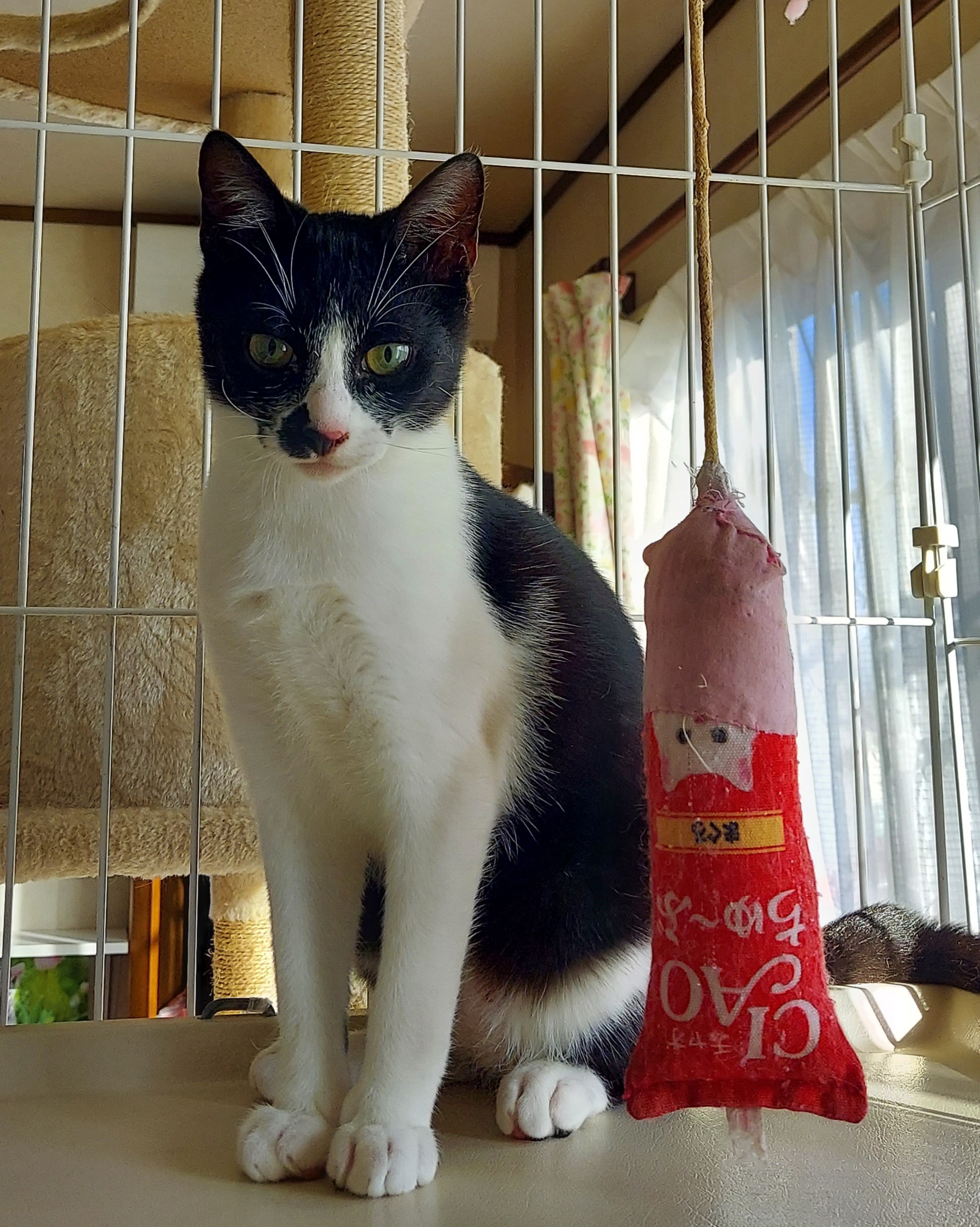同室のシニア猫たちへの感染予防のためゲージから出してあげることはできません。