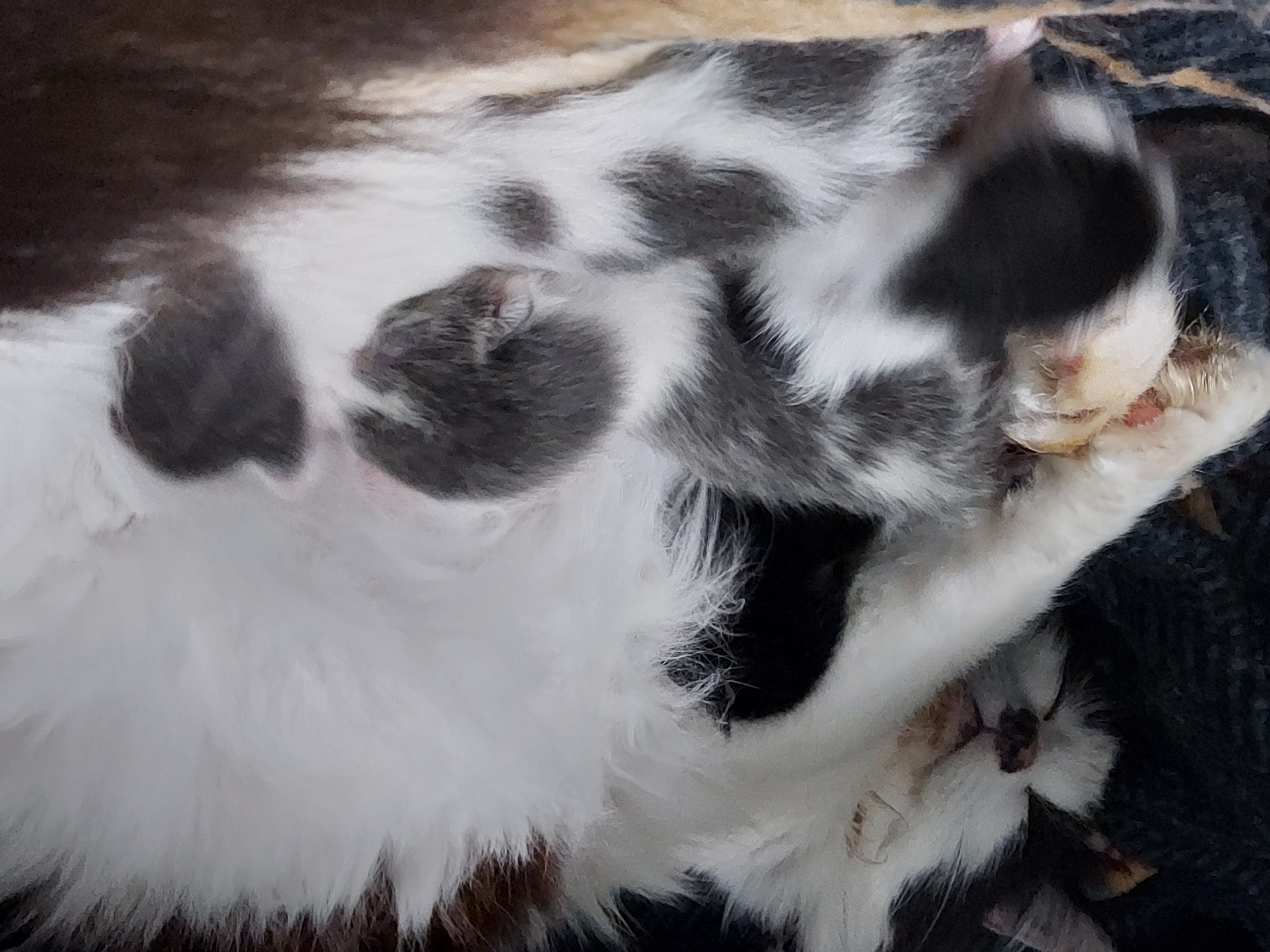 人間にはこんな風に甘えて警戒もなく、はみ出した子猫を戻したり体重を計ったりと子猫に触っても全く怒りません。本当にいい子です。