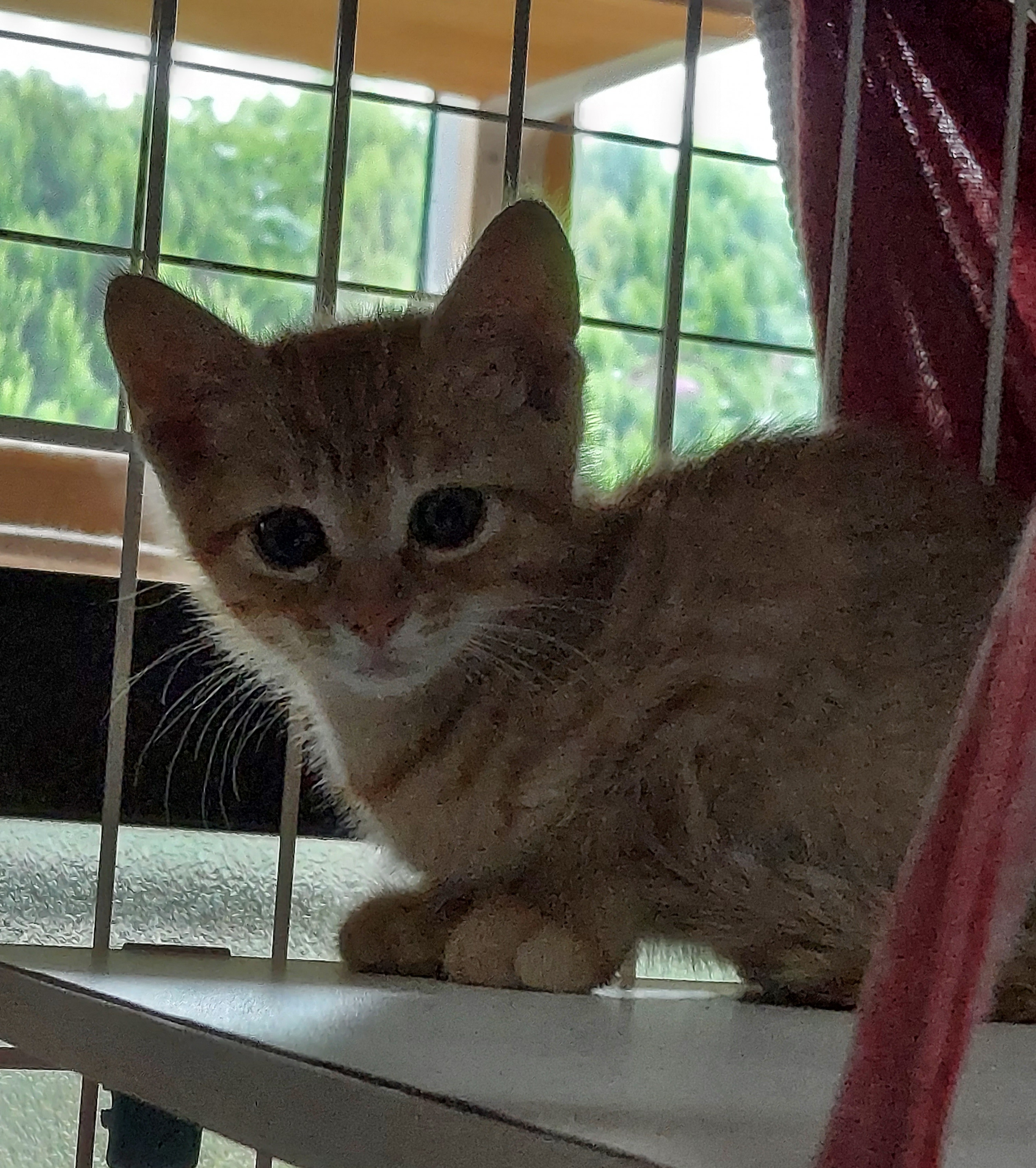 1匹の子猫はゲージから脱走して隣の部屋のママのゲージの隣で発見しました。