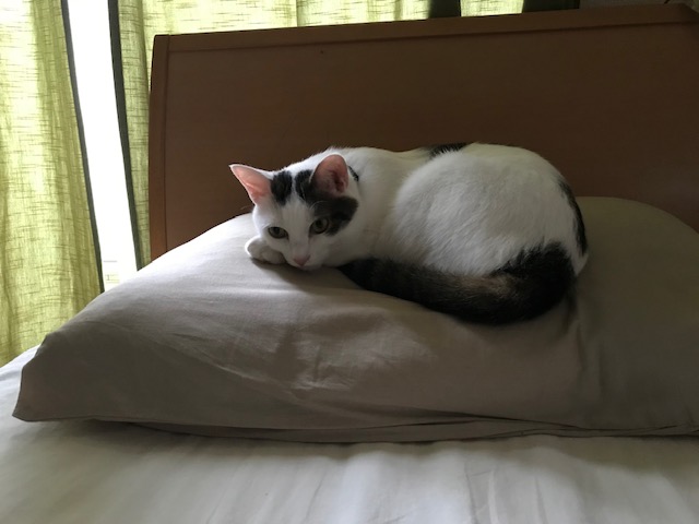 ペットボトルキャップを籠の中から落として遊ぶソラ君にママさんの枕を占領して寝ているリクくんです!