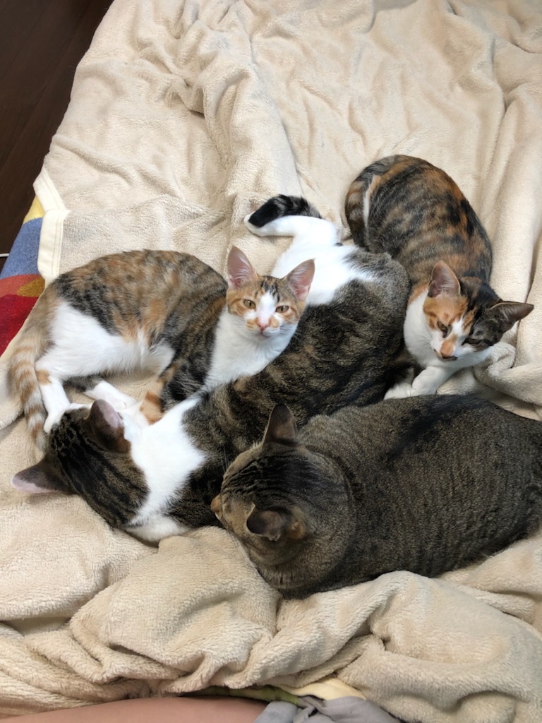 先住さん2匹に、ぶんたくんにちょびたくん、こてつくんにうめちゃん。