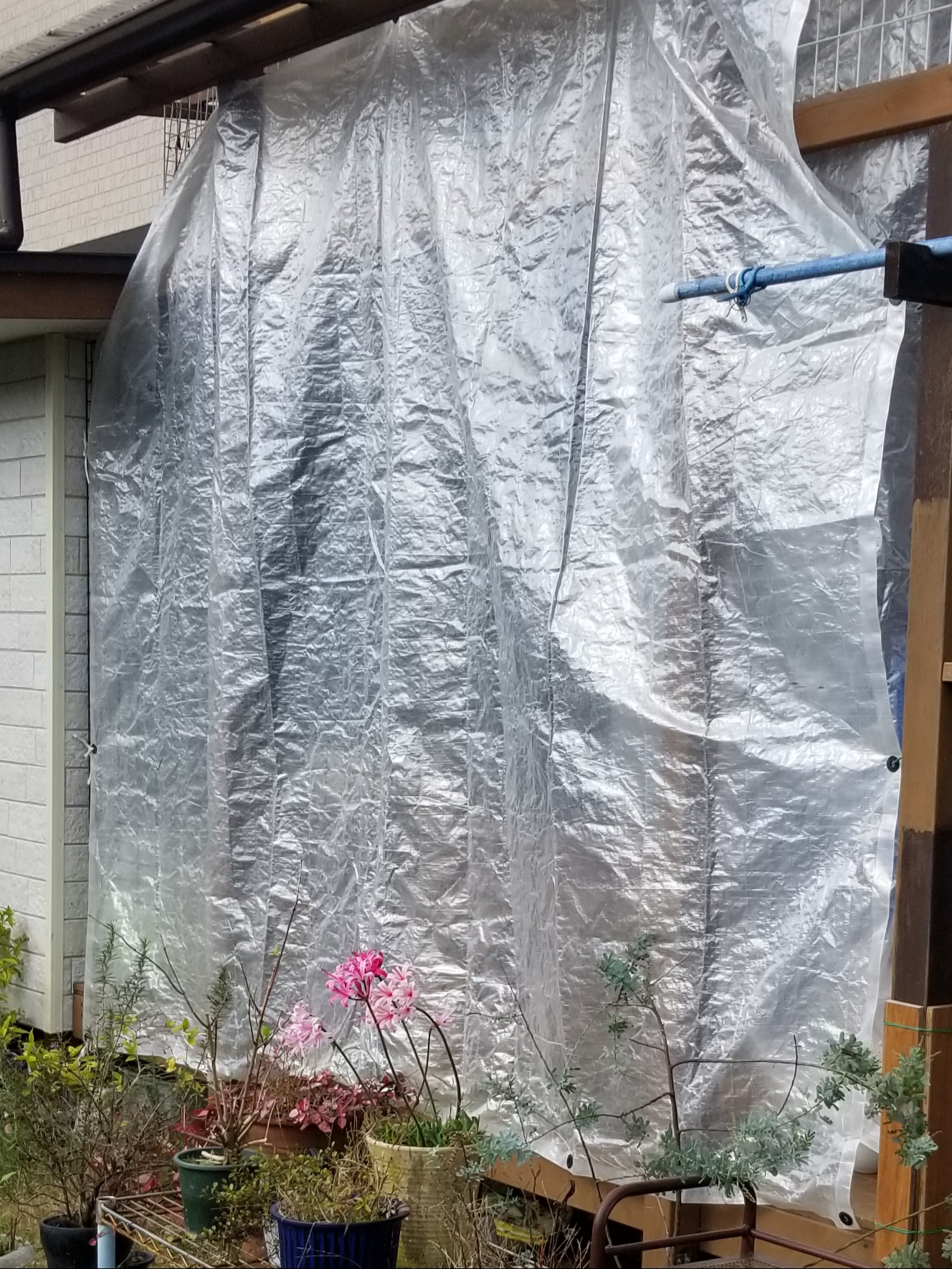 週末にウッドデッキを半透明のビニールで囲いました。