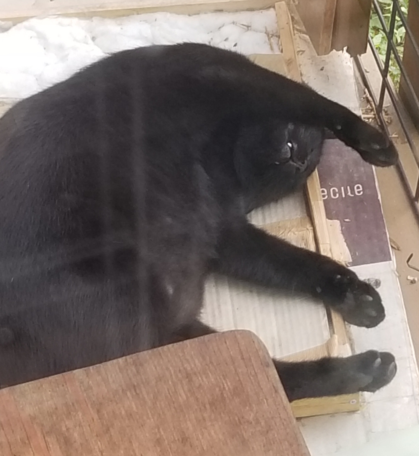 ウッドデッキを独り占めしてバンザイ寝しています。