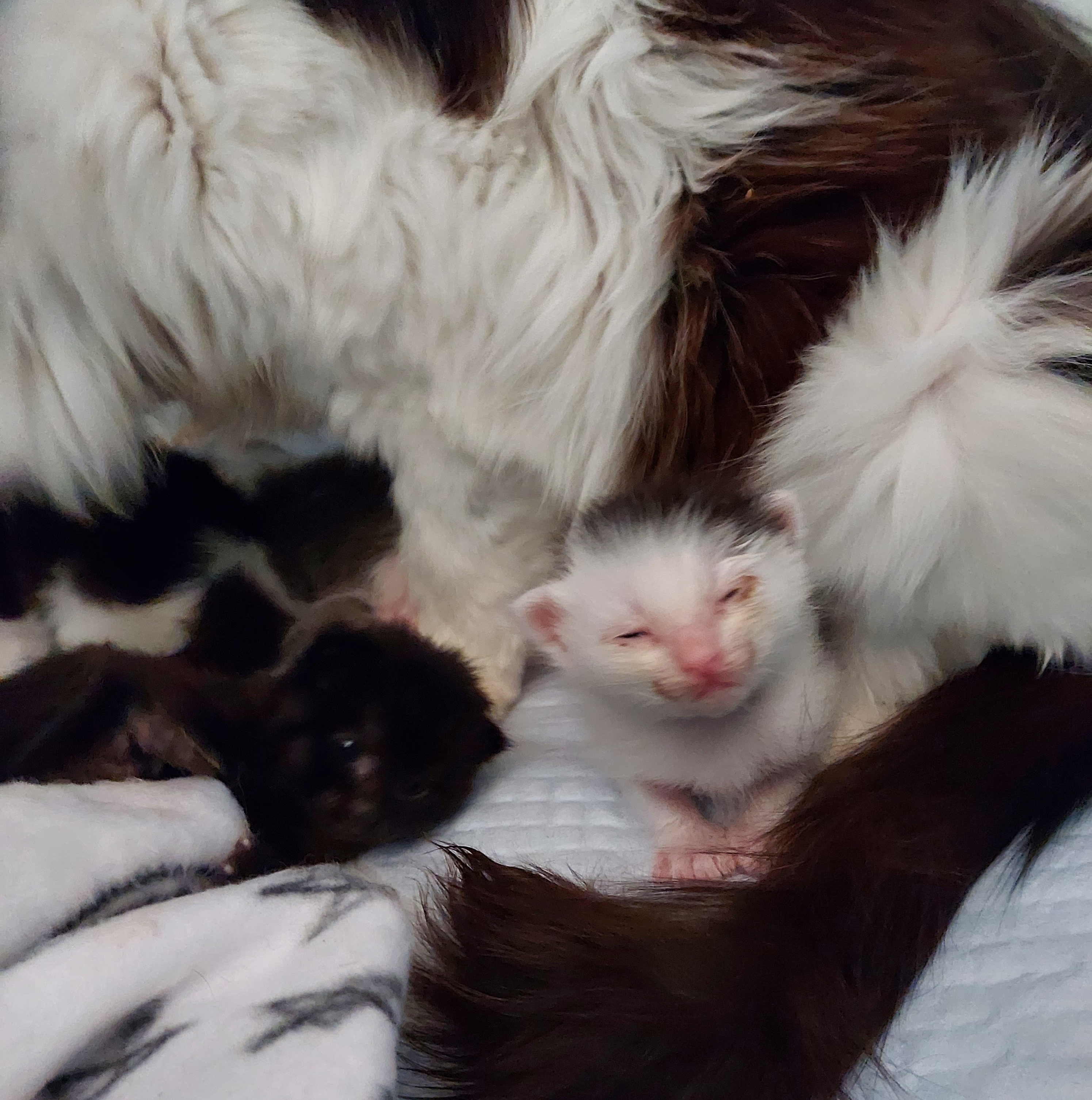 赤ちゃん猫はデイジーのおっぱいを吸おうと力いっぱい求め動きます。