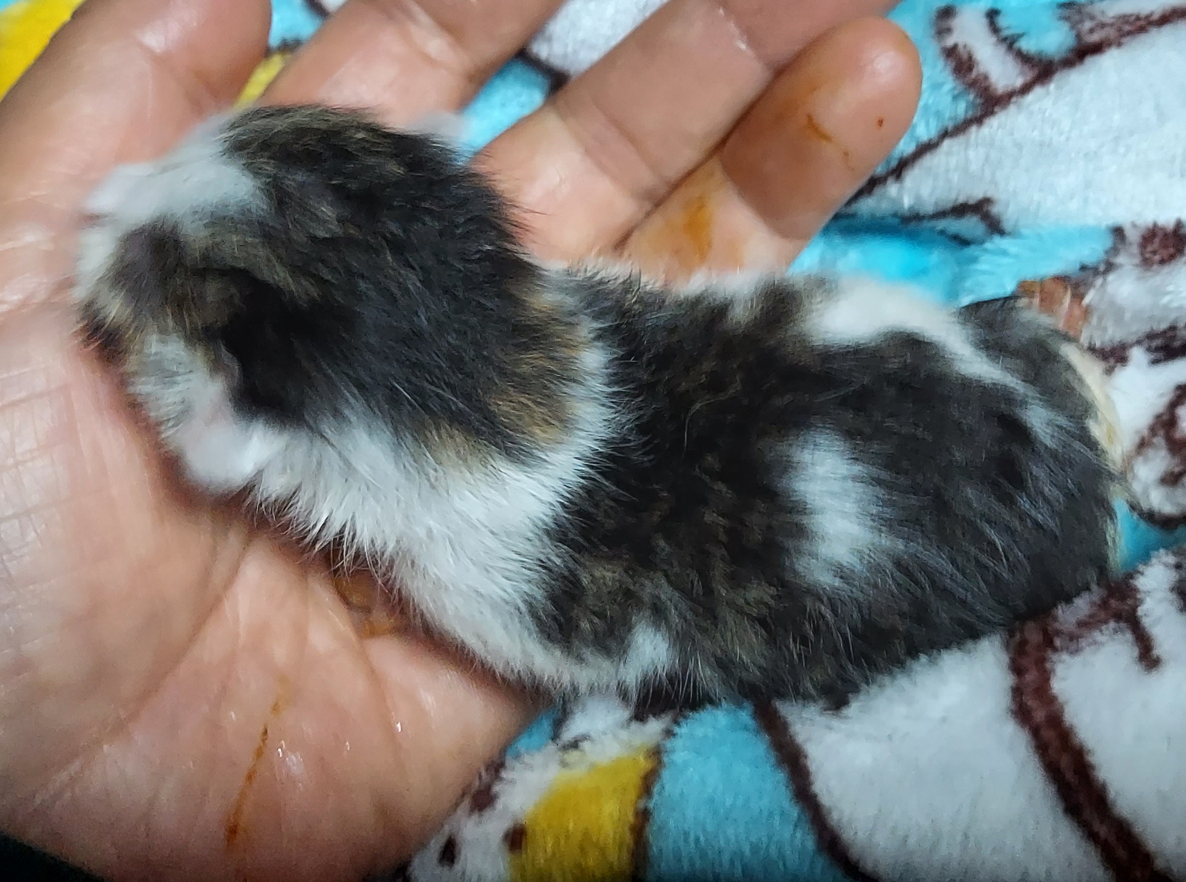 夕方ボラさん宅に行ってみると誰がどう見たって500gの子猫と兄弟とは思えない、へその緒の付いた生まれたての赤ちゃん猫でした!