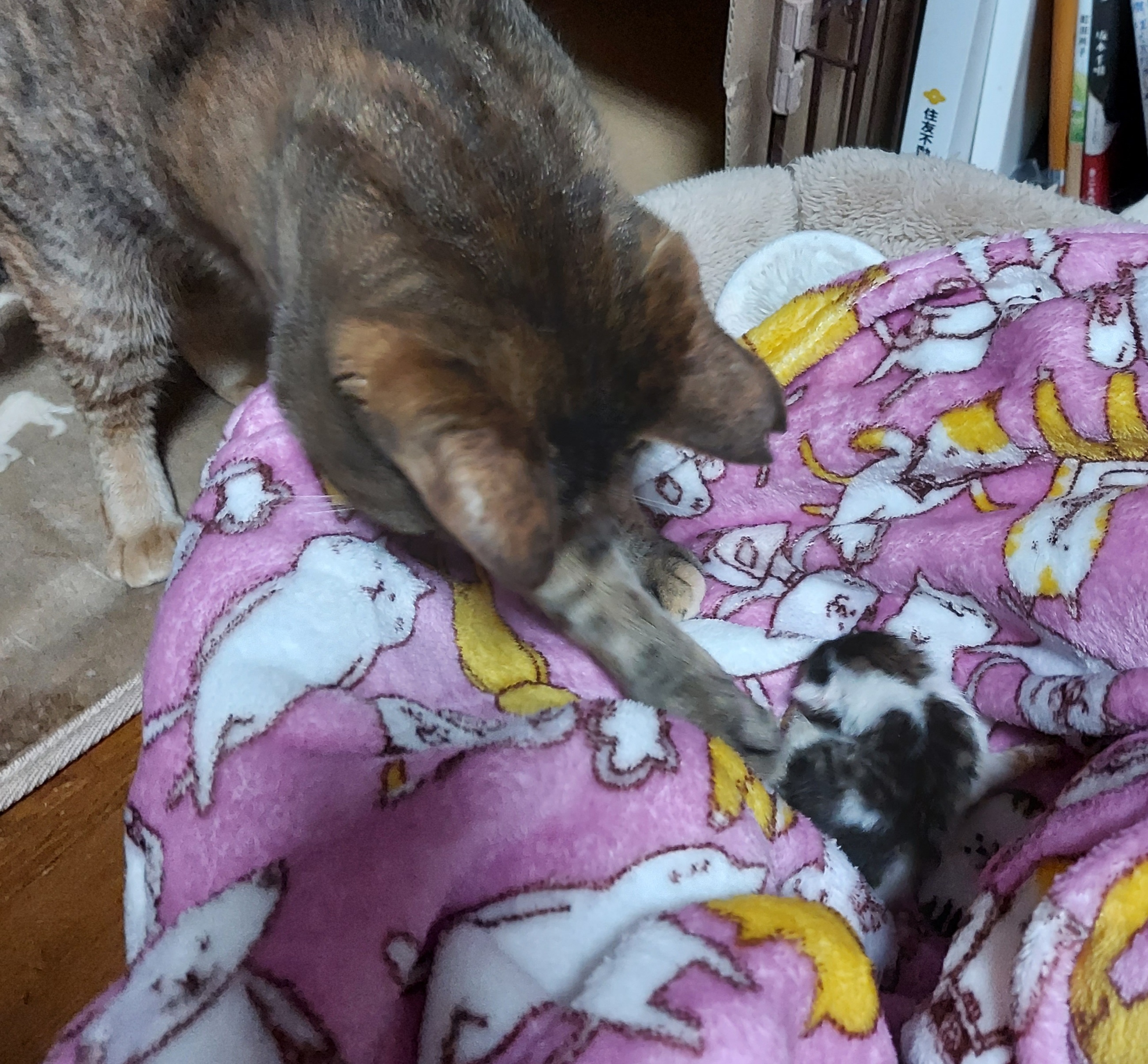 腹違いのチビクロちゃんも乳母の愛情たっぷりで元気です。