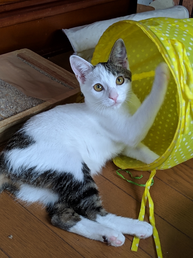 遊ぶの大好きでトイレの砂をかき出したり、一人遊びしたりと見ていて面白い子です。