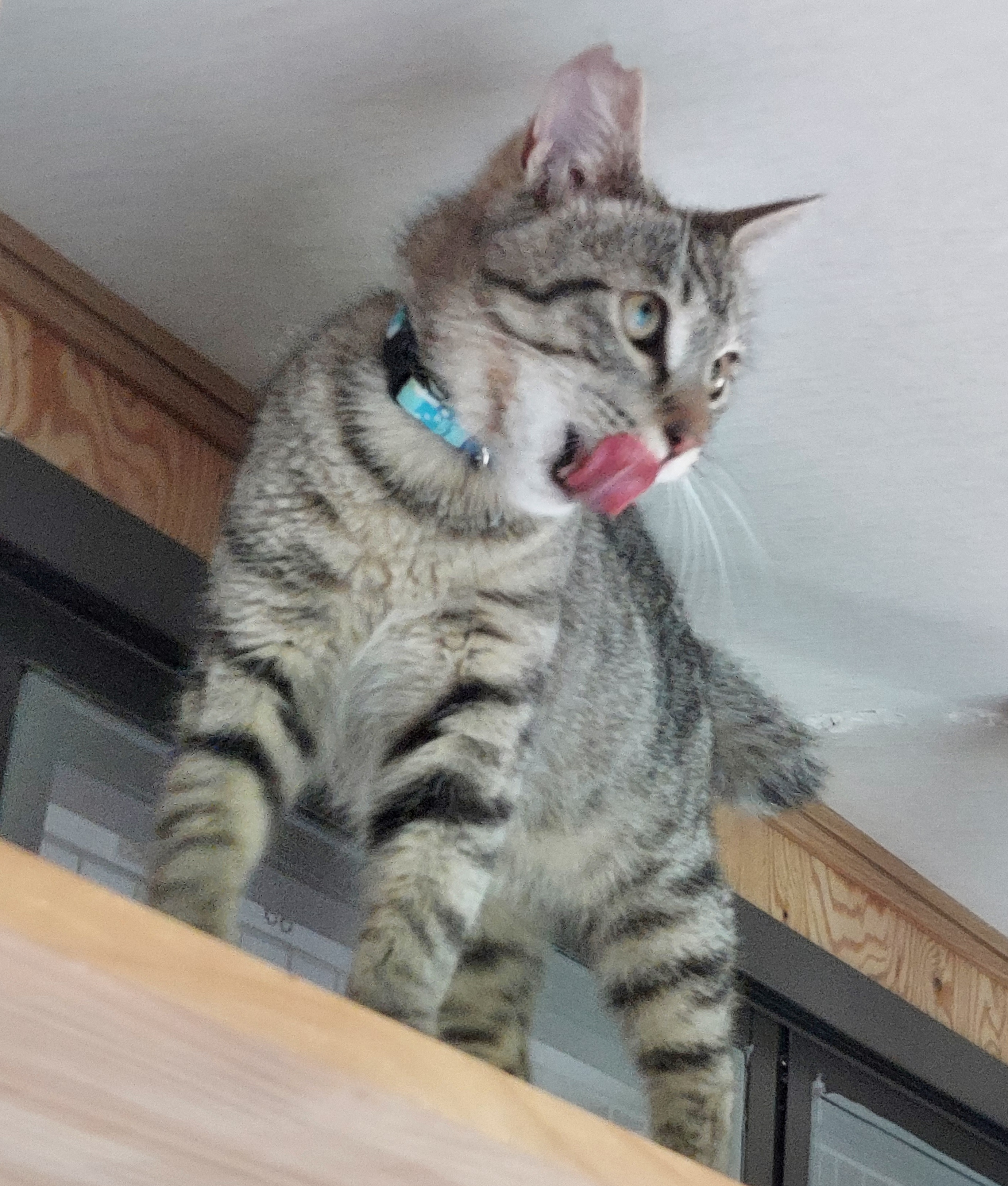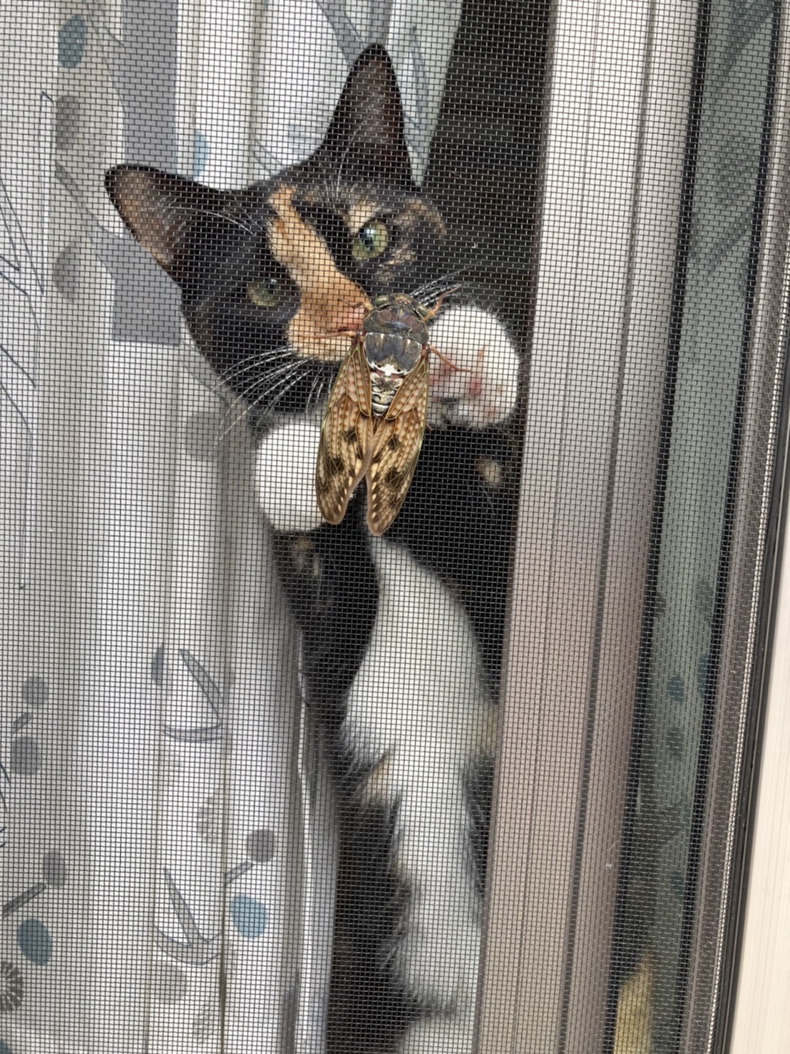 あずきちゃん、網戸に止まったセミに夢中です!お目目がキラキラしていますね!